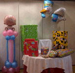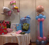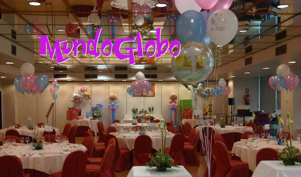 con ramos de globos, y la mesa principal con un ramo compuesto