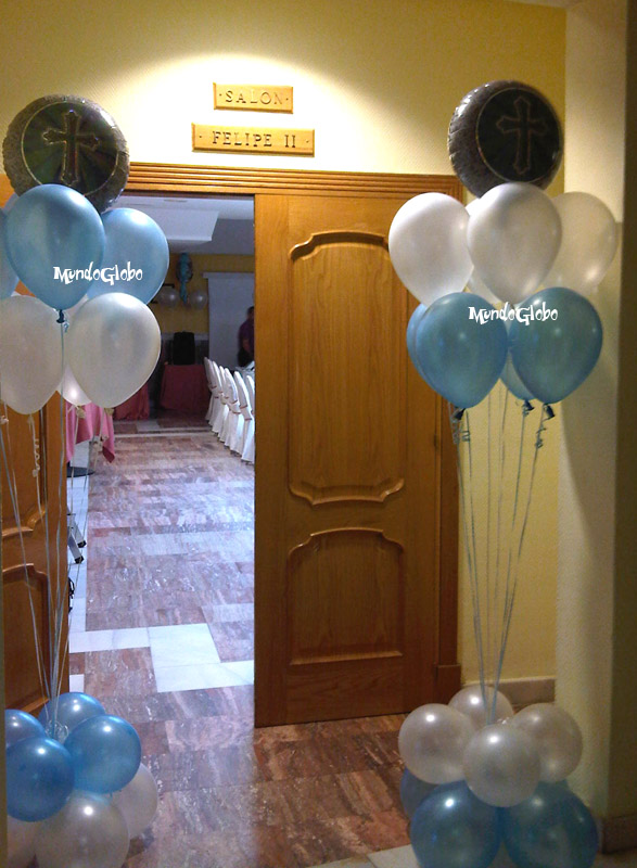Reciben a los invitados dos ramos de globos de comunión, y la