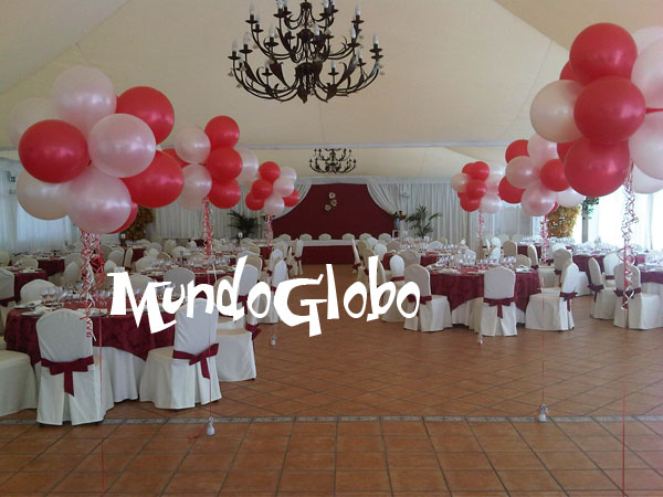 sobre columnas de flores, piñata de globos y ramos sobre las